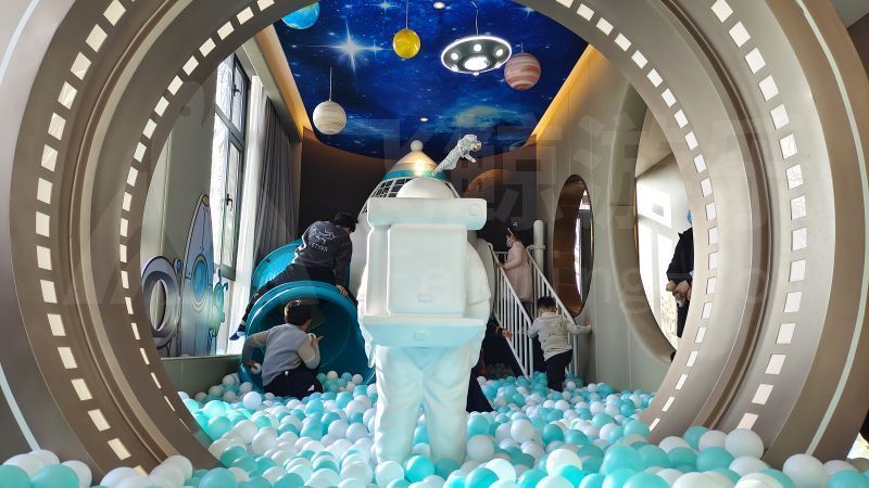 航天主题游乐设备搭配海洋球,如置身蓝色天穹。微光散落,快乐气息感染每一个人。