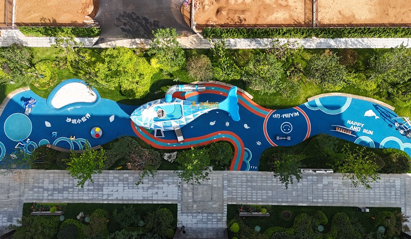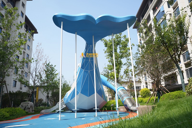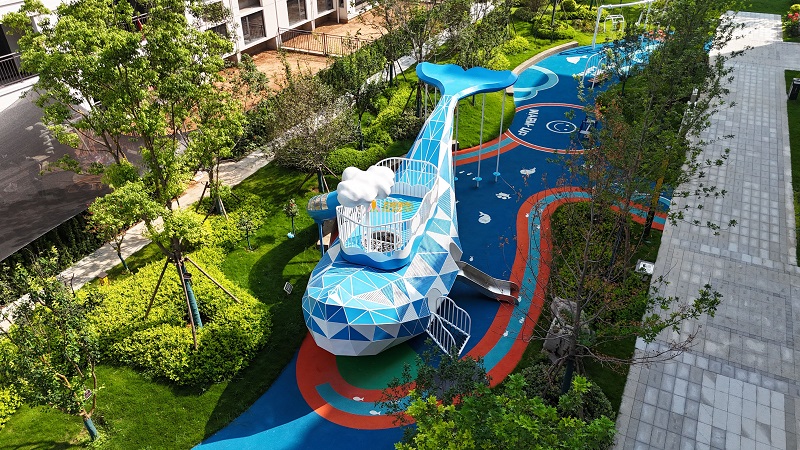 飞鲸游乐团队,结合项目场地特点,设计出以“跃动的鲸鱼”为主题的地产景观乐园。乐园集“游乐、运动、休憩和自然生态”为一体,满足家庭亲子互动需求,也为各年龄层居民提供更富创意与美感的的户外休闲空间。